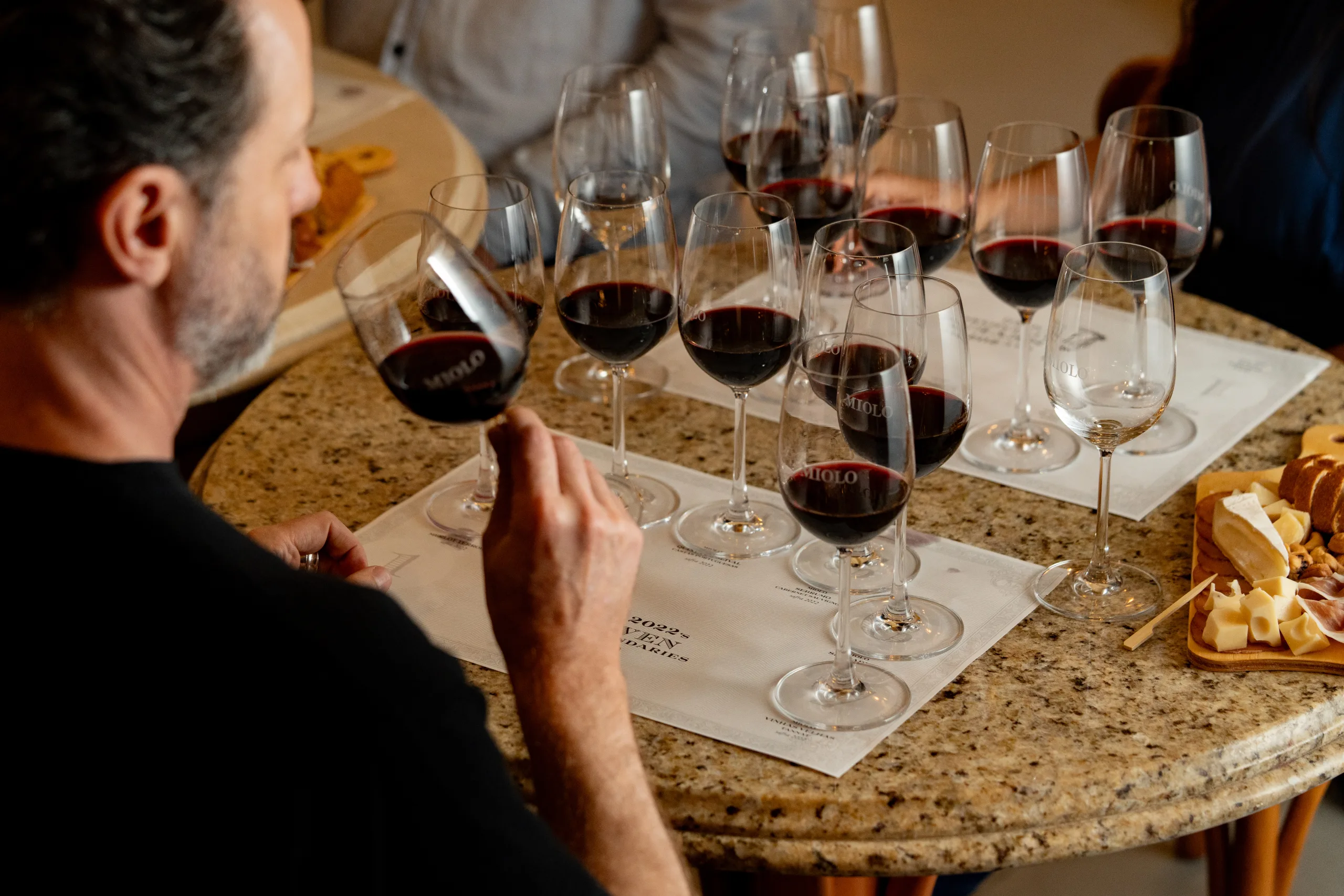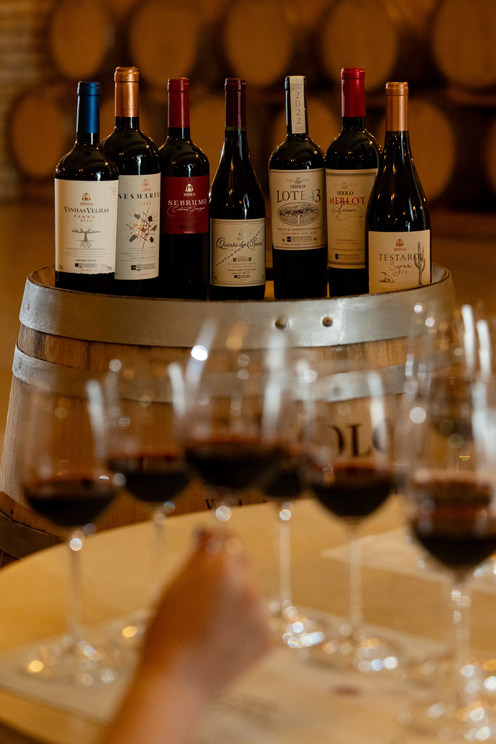 A degustação dos vinhos acontece na Cave de Barricas, em ambiente subterrâneo. Entre os rótulos estão Miolo Cuvée Nature DOVV, Miolo Millésime Brut, Miolo Giuseppe Chardonnay DOVV e dois ícones da Coleção Sete Lendários: Miolo Lote 43 e Miolo Merlot Terroir, ambos com Denominação de Origem Vale dos Vinhedos.